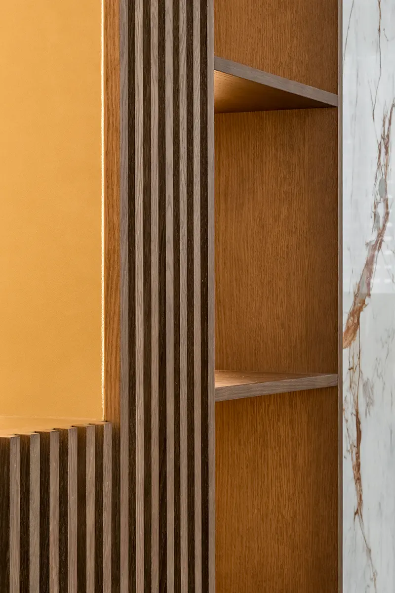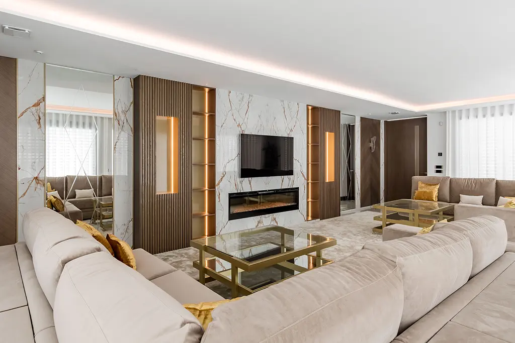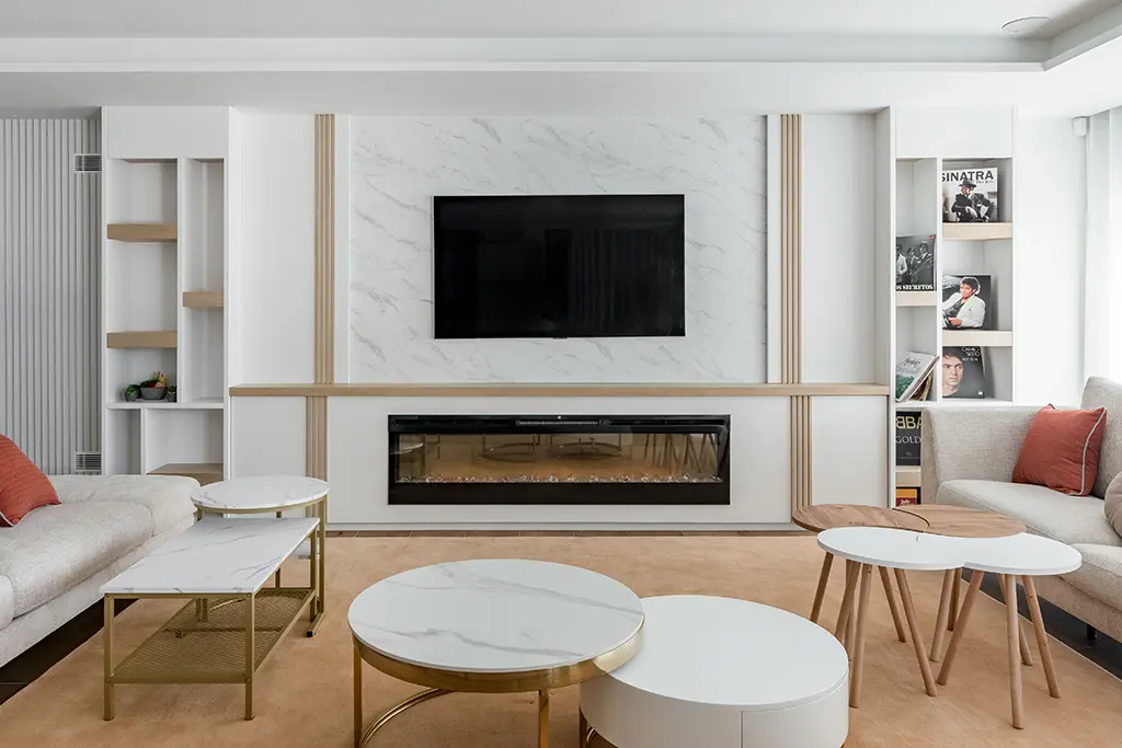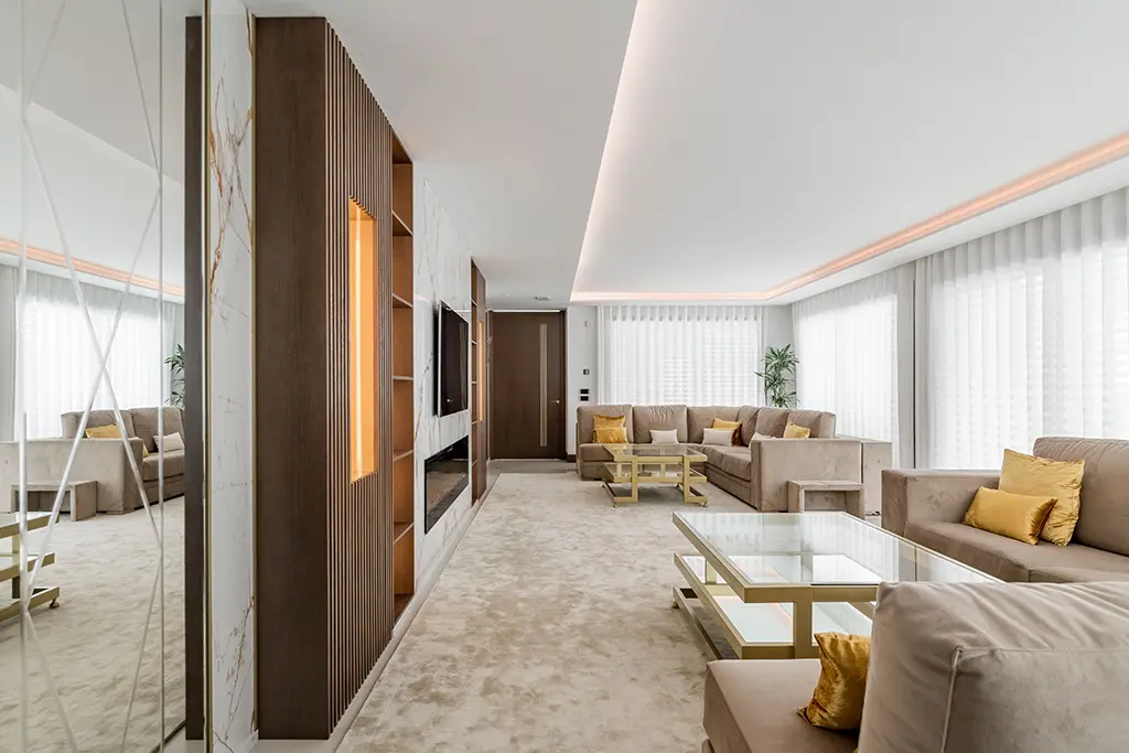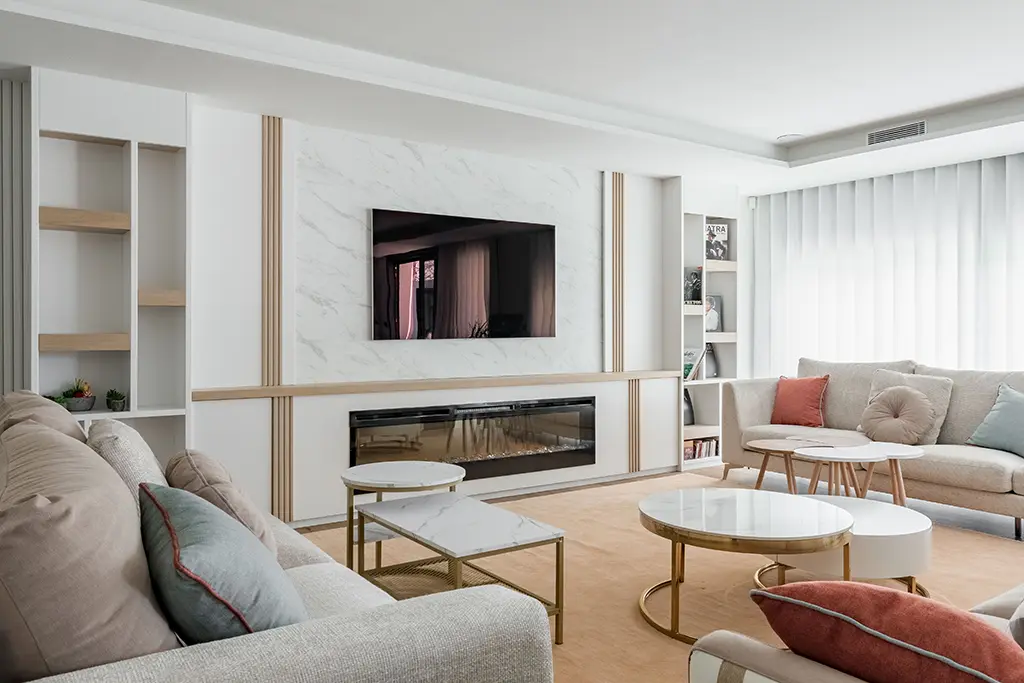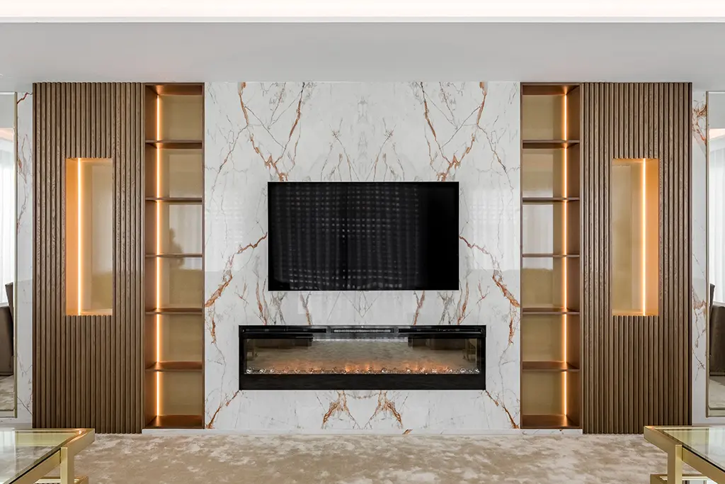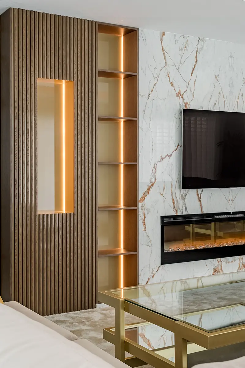 Qué gozo de trabajo. Decoramos varios salones en esta vivienda de lujo, recreando una atmósfera diferente según el objetivo que los dueños perseguían en cada estancia. El gran salón de televisión, destinado a recibir amigos y disfrutar de noches de cine al amor de la lumbre, lo imaginamos con tonos madera, topo y bronce. Diseñamos un panel con acabado en mármol para enmarcar la televisión y la chimenea empotrada. A ambos lados, muebles de madera con estanterías y columnas de palillería horadada con vanos. Añadimos iluminación led para elevar el conjunto. ¿Qué os parece el efecto? ¡Impresionante!