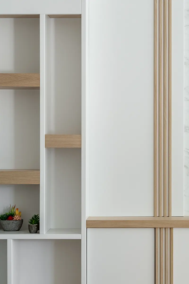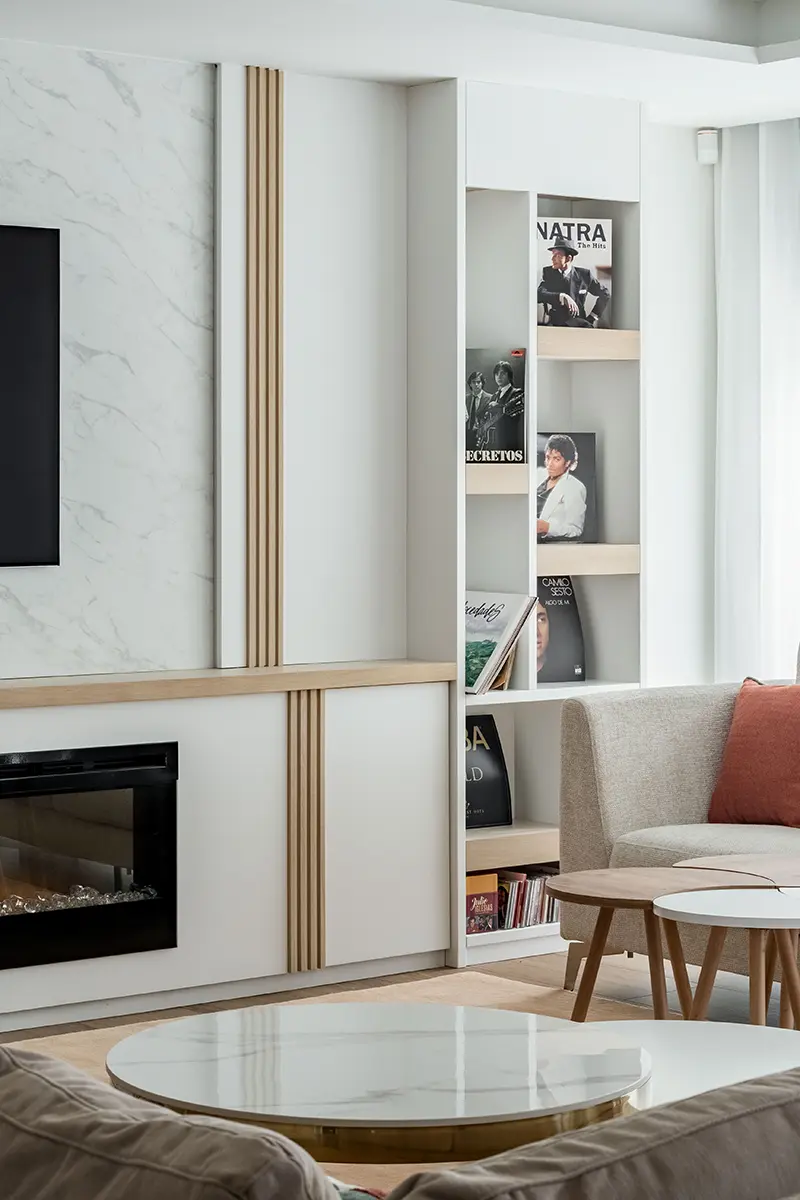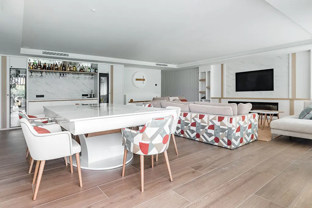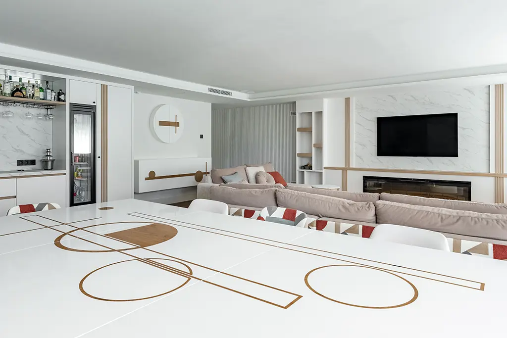 En el segundo salón ganó el blanco, el teja, los marrones y las formas geométricas. ¿Qué buscábamos aquí? Un lugar para pasar tiempo donde se pudiera comer en una gran mesa, tomar copas en la ingeniosa barra de bar y disfrutar también de películas o videojuegos. Incluimos chimenea bajo la tv y una discreta palillería de madera de roble sobre el blanco dominante. La mesa y las sillas las diseñamos con las figuras geométricas que decoran también los frentes de armarios. Acabado en mármol para la zona de mueble bar, custodiado por elegantes vitrinas refrigeradas cargadas de refrescos. ¡Cuántos buenos momentos os esperan aquí!
