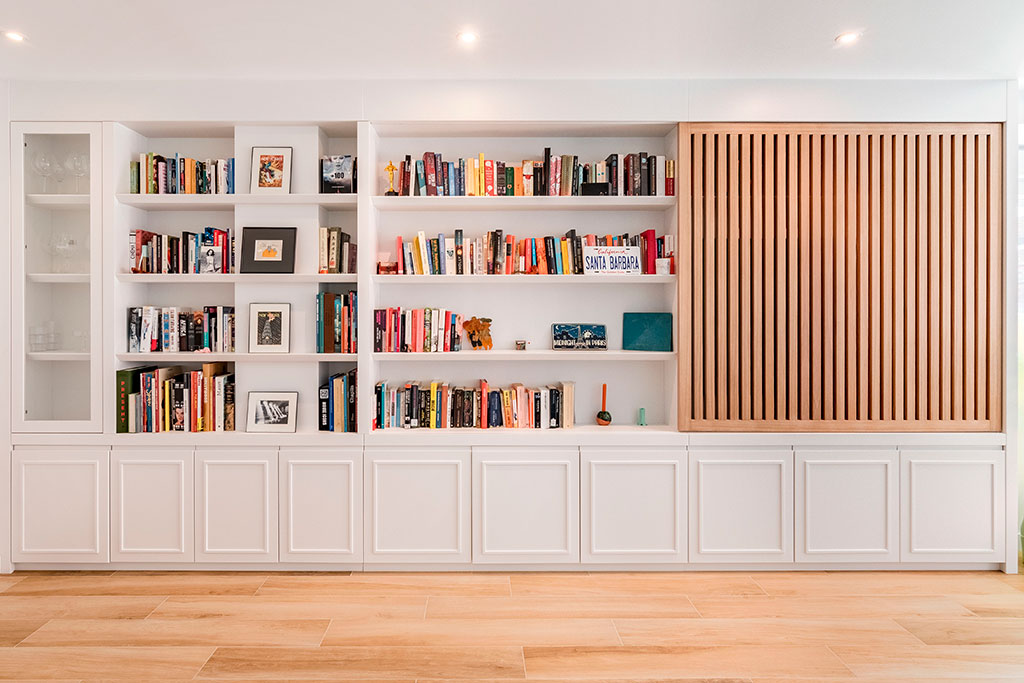 Estos clientes nos pidieron un diseño integral de librería de salón, que integrara alguna solución ingeniosa para escamotear la enorme pantalla. La palillería de madera nos daba la excusa perfecta para introducir un material cálido y colorido, que a la vez que aportaba diseño cumplía con un cometido.