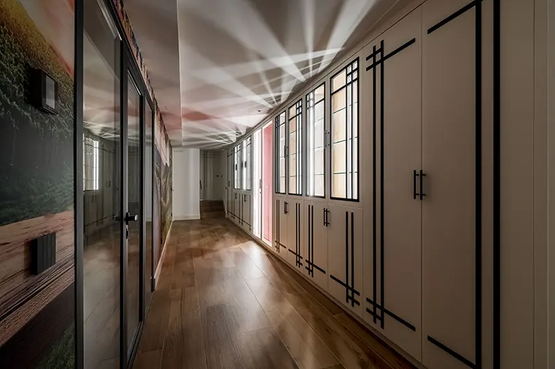 Para la vinoteca hubimos de aprovechar un espacio de pasillo que ofrecía, no obstante, tremendas posibilidades. Salvamos las columnas y escaleras, instalando en un lado del pasillo los estantes, puertas y mecanismos necesarios para preservar los caldos, y habilitando al otro lado un espacioso armario para…todo lo demás. Bebamus mea Lesbia, atque amemus…